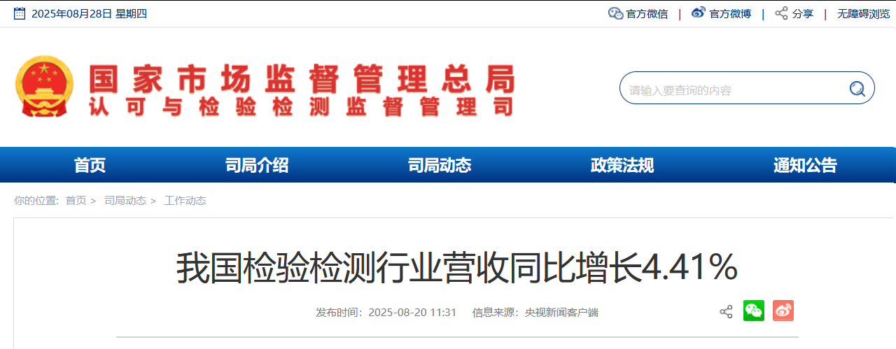 我國檢驗(yàn)檢測(cè)行業(yè)營收同比增長(zhǎng)4.41%